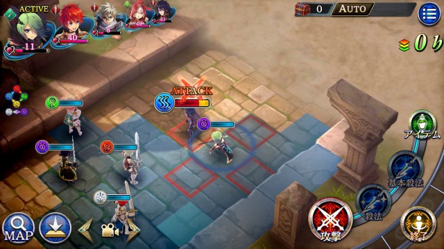 シミュレーションRPGというジャンルに属するゲームで、キャラ一人ひとりを将棋の駒のように見立て、四角形のマスで区切られたマップの中を進軍していく。